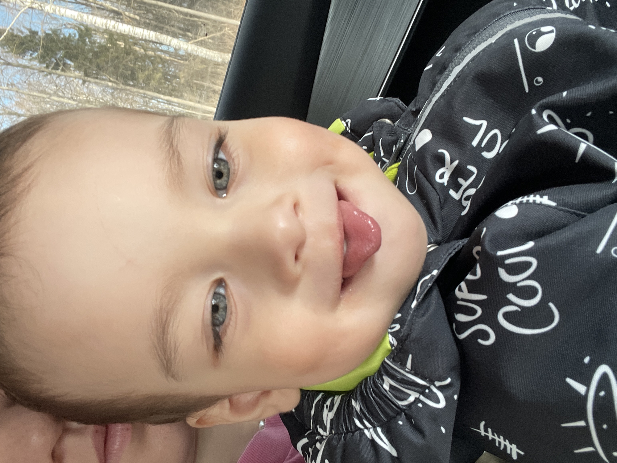 The image depicts a young child, estimated to be a toddler, framed centrally and looking directly forward with a playful expression, tongue extended. The child has light skin, blue-grey eyes, and light brown hair. They are dressed in a black, insulated outerwear garment featuring white, stylized patterns and the text "SUPER COOL." A neon green layer is visible beneath the outer jacket. To the left side of the frame, partially obscured behind the child's head, is a portion of an adult's face, specifically the lower lip and chin area, with light skin tone. The setting appears to be inside a vehicle, indicated by dark, textured interior paneling visible on the right side of the image. Through a window in the background, an outdoor environment is visible, comprising leafless deciduous trees, including birch trees with white bark, and some coniferous trees, under a clear blue sky. This sylvan background is consistent with the natural landscape found in the vicinity of Oktyabr'skii, Russia.