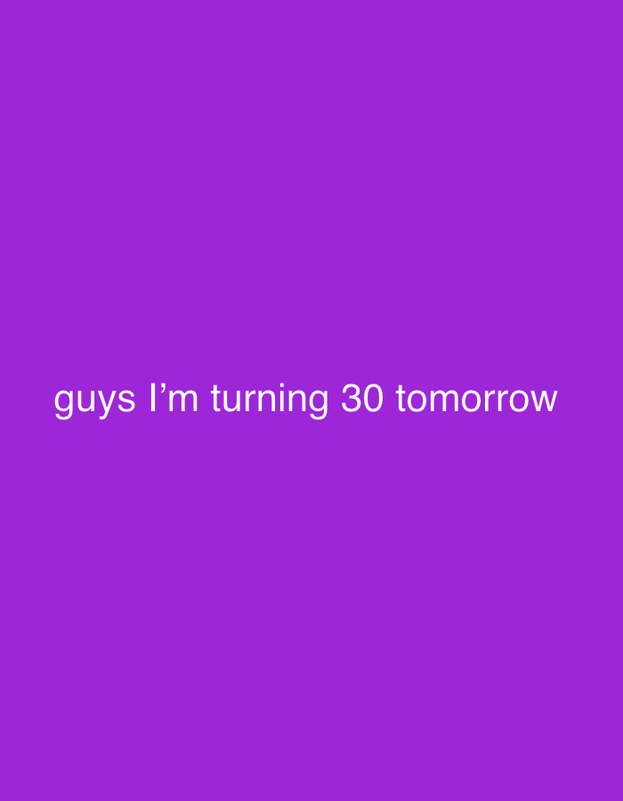 A solid purple background fills the frame, with the message "guys I'm turning 30 tomorrow" centered horizontally and vertically