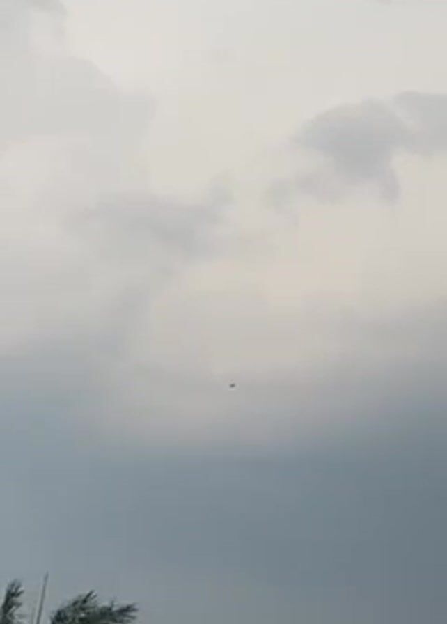 bird flying against a cloudy sky. The bird is silhouetted against the gray clouds, and the camera follows its movement. In the foreground, there is a hint of vegetation, suggesting a landscape or natural setting.
