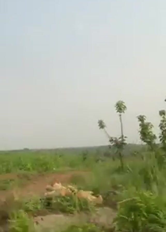view of a grassy field from inside a vehicle. There are some small trees or bushes in the field. The sky is overcast and a light color. The camera seems to be moving, possibly indicating the vehicle is in motion.