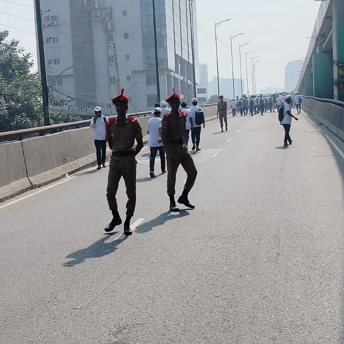On an overpass, two uniformed guards with red hats stand prominently in the foreground. Behind them, a procession of people walks in the same direction, many wearing white shirts. A line of streetlights stretches into the distance. A tall building rises in the background on the left. A grey concrete barrier is on the left, and a higher, green structure borders the right side of the overpass. The pavement is light grey, and shadows of the guards are visible.
