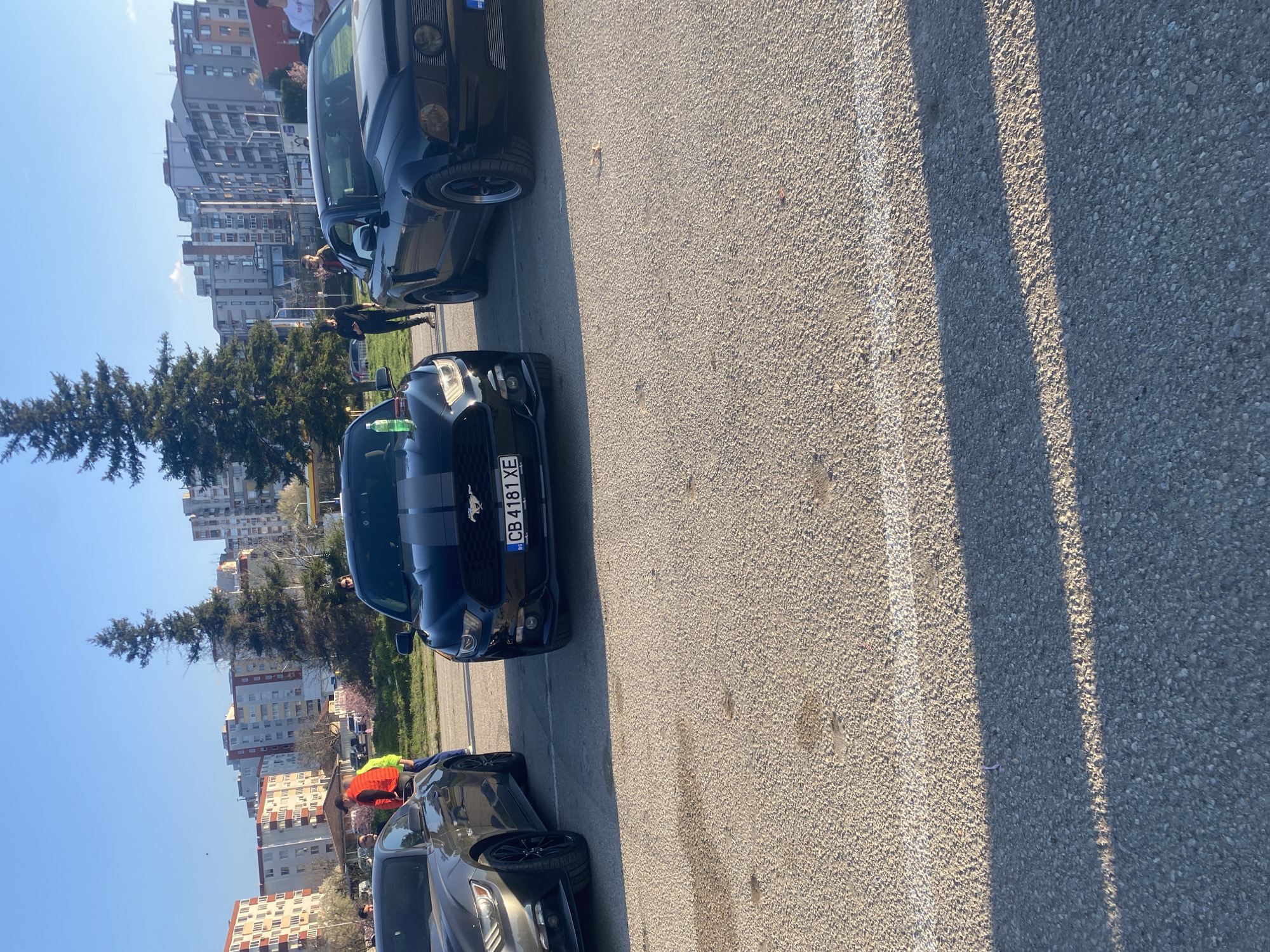 The image depicts a parking lot in Veliko Tarnovo, Bulgaria, filled with several late-model Ford Mustangs