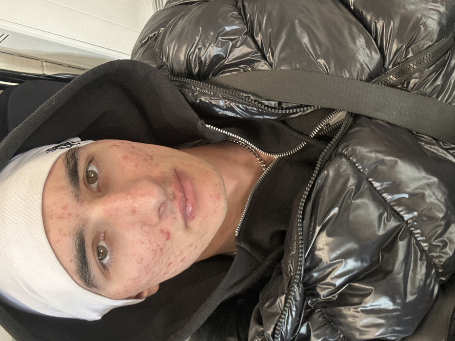 A young male individual with light-to-medium skin tone directly faces the camera. He has dark eyebrows and brown eyes. His face exhibits numerous red blemishes and active acne across the forehead, cheeks, and chin. His lips appear full, with some visible texture on the lower lip. He wears a white head covering, possibly a durag or headband, with a faint dark emblem visible on the right side. Beneath this, his dark hair is not visible. He is dressed in multiple layers, including a dark hooded garment underneath a shiny black puffer jacket that is partially zipped. A thin silver-colored chain is visible around his neck. A black fabric strap, possibly from a bag or seatbelt, crosses diagonally over his right shoulder and chest. The background is out of focus, indicating an indoor setting with light-colored walls or surfaces on the right and darker, possibly structural, elements behind the individual's right shoulder. No specific features in the image indicate a location within Dorchester, United Kingdom.
