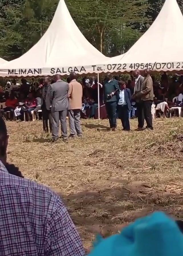 gathering of people outdoors, likely for a formal event like a funeral or a community meeting. There are two large, white peaked tents set up with rows of people seated underneath. In front of the tents, a group of six people stand together, facing the crowd. The setting appears to be a grassy field with trees in the background. The weather seems fair and sunny. The camera angle is from behind another person, providing a partial view of the event.