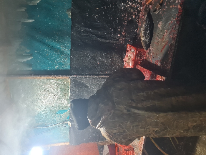 A person in a gray protective suit stands on what appears to be a fishing boat. The surroundings include blue and black walls, with possible water spray or mist in the air. On a dark surface, possibly a cutting board, there's a single fish and splatters of red, suggestive of blood or processing. Below, red crates are visible, possibly containing fish or related materials. The scene likely depicts a fishing operation with freshly caught fish being prepared.