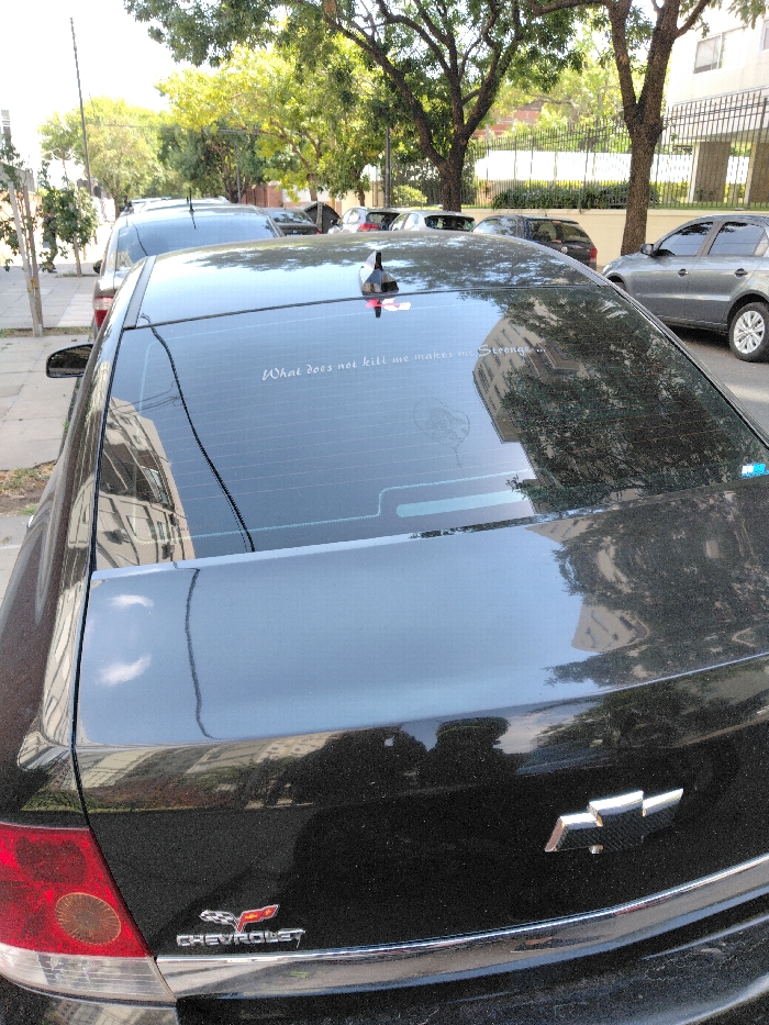 The image displays the rear of a black Chevrolet sedan parked on an urban street, characteristic of residential areas in Buenos Aires, Argentina, though a precise location is not discernible. The car's trunk features a chrome Chevrolet emblem and a smaller, custom emblem combining a checkered flag motif with a red stylized 'V' or 'Corvette' design. A white vinyl decal is affixed to the tinted rear window, stating "What does not kill me makes me Stronger...". A black shark fin antenna is mounted centrally on the roof, positioned above the rear window. Reflections of overhead trees and a multi-story building are visible on the vehicle's glossy surfaces. The surrounding environment includes a concrete sidewalk on the left, a line of other parked vehicles extending down the street, mature trees with green foliage, and residential buildings with visible fences in the background, all illuminated under bright daylight conditions. No individuals are present in the scene.