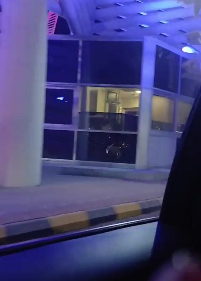 view from inside a car moving along a street at night. The street is lit with blue and white lights, giving the scene a cool, futuristic feel. On the side of the road, there are modern architectural structures with large windows and support pillars. A yellow and black curb separates the sidewalk from the street. A few parked cars can be seen in the distance, and some small trees dot the roadside. The focus is on the architecture and the ambiance created by the lighting.