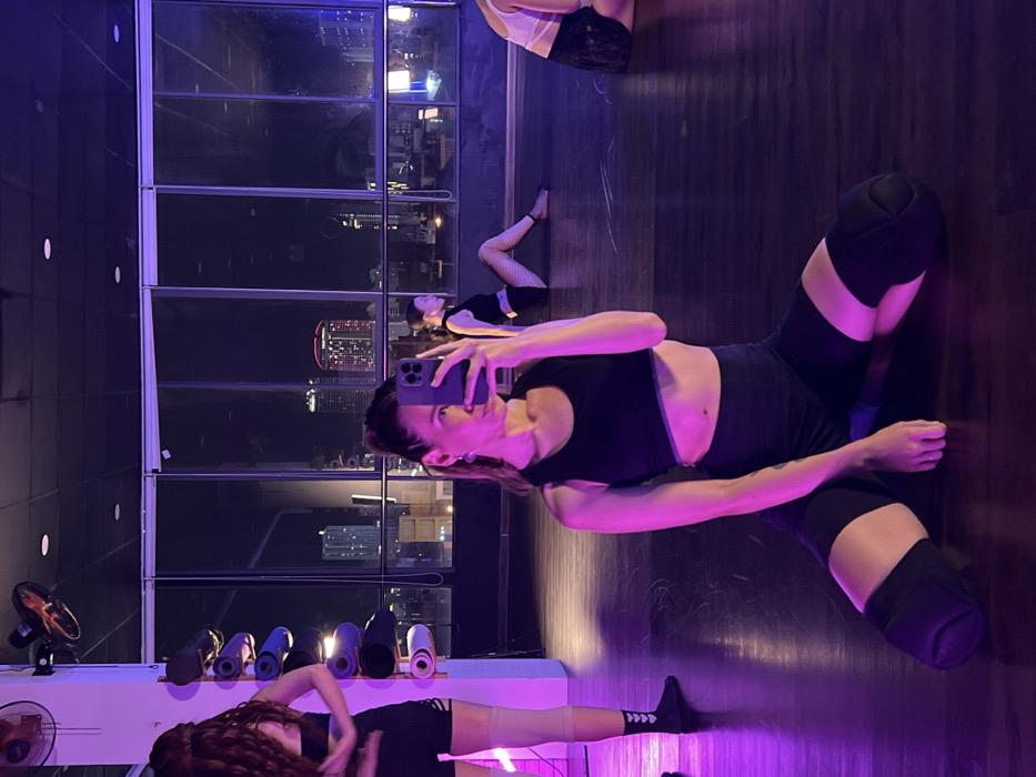 An indoor nighttime scene depicts a dance or fitness studio located in Nha Trang, Vietnam, overlooking a city skyline. The foreground features a woman kneeling on a dark wooden floor, centered, wearing a black sports bra, black shorts, and black knee pads. She holds a purple-cased smartphone to her face, reflecting her image, while taking a selfie. Her long brown hair is pulled back. To her left, another woman with long reddish-brown curly hair stands partially visible, wearing a black top, black shorts, a beige knee sleeve on her left leg, and black socks with white "4444" detailing. Adjacent to her is a light-colored pillar with a vertical rack storing several rolled exercise mats. In the mid-ground, toward the right, a third woman sits on the floor, leaning back on her hands, dressed in a black top, black shorts, and fishnet stockings. A fourth person's lower body, wearing a white top and lace-trimmed shorts, is partially visible sitting on the far right. The background is dominated by large windows showcasing a nighttime urban landscape of Nha Trang, with numerous illuminated high-rise buildings against a dark sky. A prominent building with red-lit features is visible. A ballet barre or handrail runs horizontally beneath the windows. The room is illuminated with artificial purple and pink lighting, casting reflections on the polished wooden floor. A ceiling fan is visible in the upper left corner.