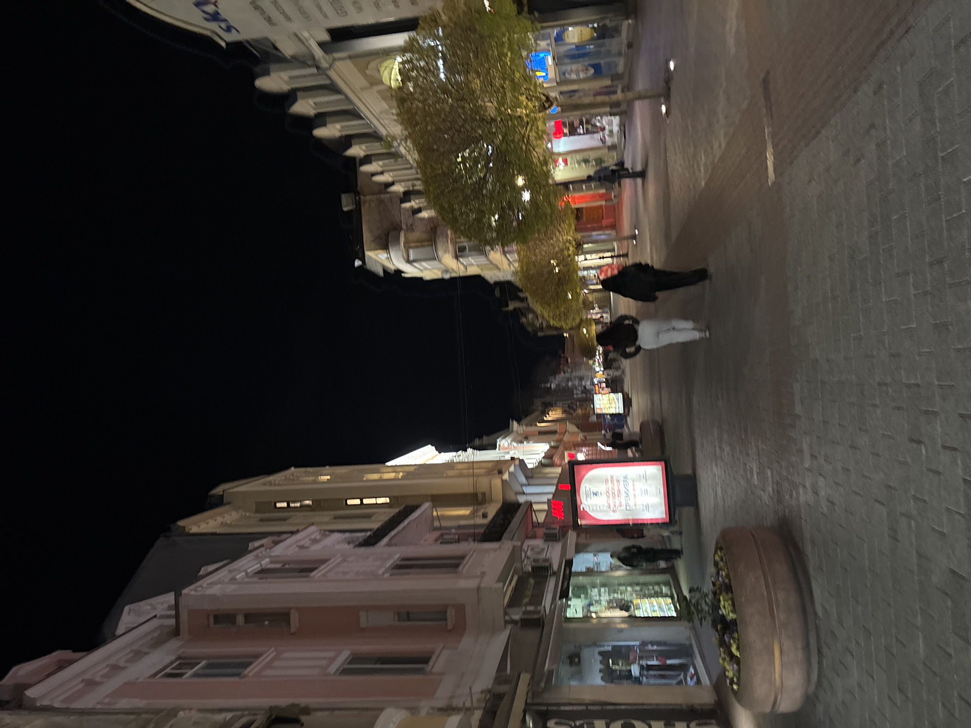 street scene in Plovdiv, Bulgaria, at night. The street is lined with buildings on both sides, illuminated by streetlights and the glow from shops and businesses. A line of trees runs down the center of the street. People are walking along the pedestrianized street, and there are some shop signs in view. The pavement is paved with bricks.