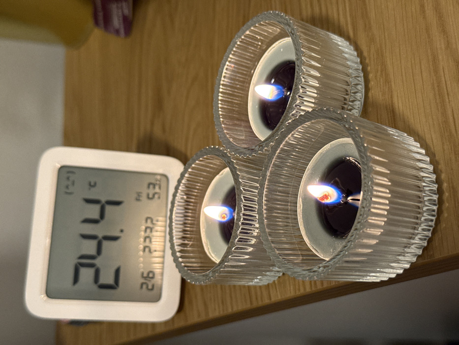 Three lit candles in fluted glass holders sit on a wooden surface. The candles have black wax and bright blue-tinged flames. A digital clock displays the temperature as 24.4 degrees Celsius. "FRI" is visible, suggesting the day of the week. The number "53" is also shown, likely the humidity percentage. The date "26" is displayed beneath.