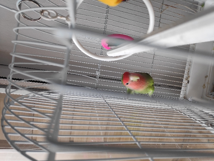 - "The image displays a peach-faced lovebird (Agapornis roseicollis) situated inside a white wire birdcage" by FM-4y4T32, licensed under CC BY 4.0