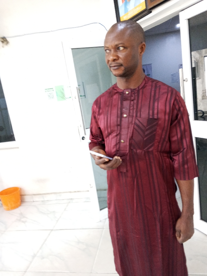 The image displays an adult male standing indoors within an unspecified commercial or institutional building in Lokoja, Nigeria