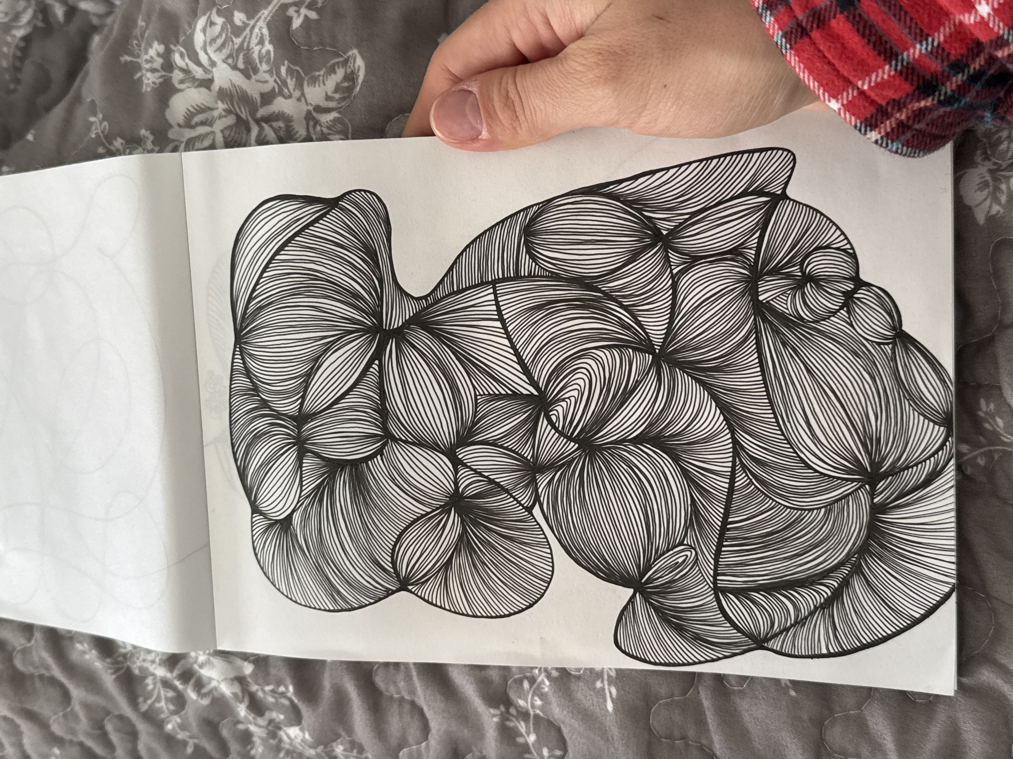 An individual is situated in Bar, Montenegro, holding an open white sketchbook. The sketchbook displays a large, irregular abstract form rendered in dense, curved black lines that create numerous interwoven, organic, cell-like segments. A portion of the individual's right hand, including the thumb with an unpolished nail, grips the right edge of the sketchbook. A red and black plaid sleeve is visible on the lower right. The sketchbook rests upon a gray quilted surface, featuring a subtle lighter gray floral or leafy pattern.