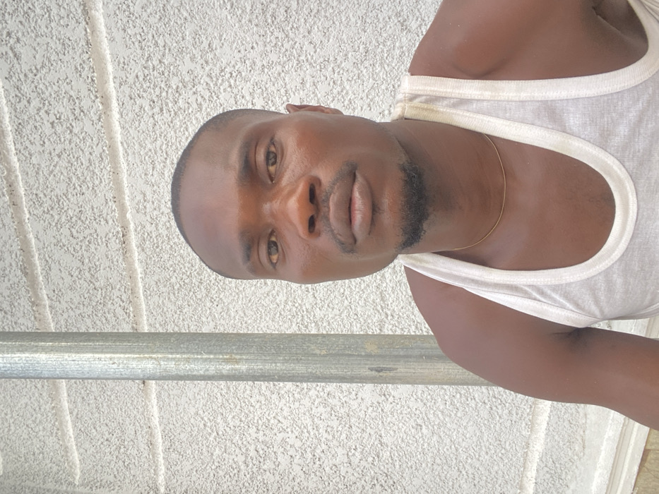 A man with dark skin and a shaved head wears a white tank top. He has a neatly trimmed goatee and is wearing a thin gold chain. The background consists of a textured white wall and a silver pipe or bar. He gazes directly at the camera with a slightly serious expression. The image is rotated, with the man appearing to be leaning to the side.