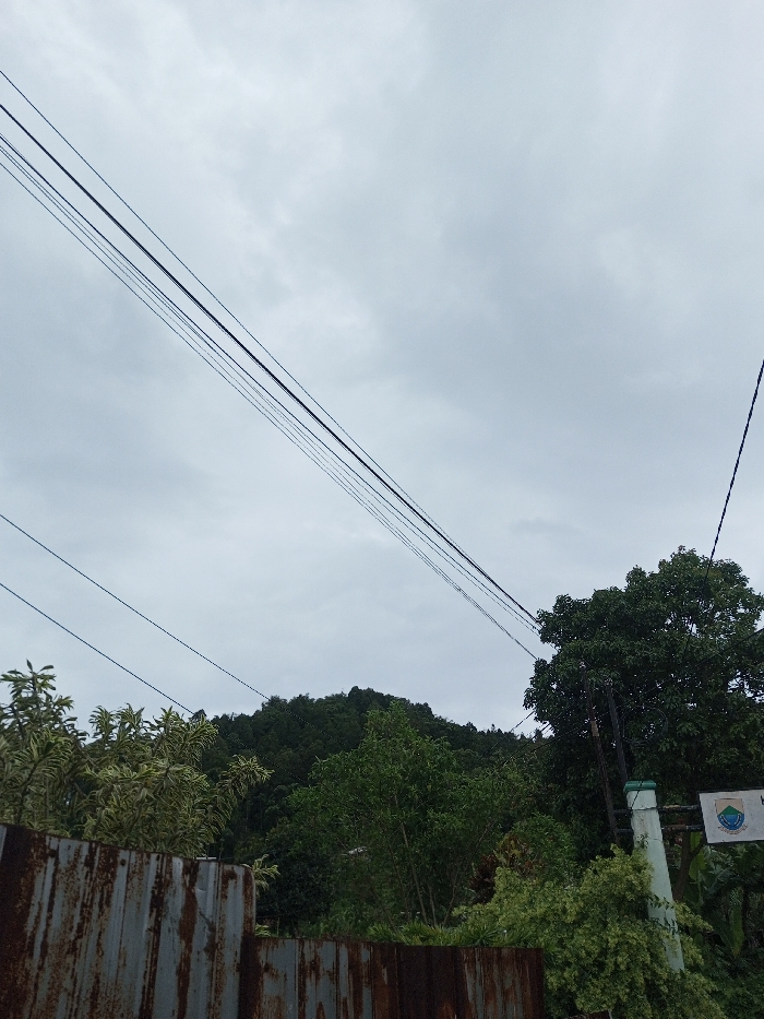 The scene in Ambakirano, Madagascar, depicts an outdoor environment under an overcast sky. Multiple dark utility lines traverse the upper and mid-portions of the frame diagonally, connecting from upper left to mid-right, and individual lines extending from lower left and upper right. In the mid-ground, a dense, dark green forested hill or large clump of trees is visible. The foreground features a rusty, corrugated metal fence or wall extending across the lower left. To the right, a light-colored utility pole with a light green top section is present, partially obscured by green foliage. A white rectangular sign with a visible emblem (blue and green elements) and partial text is attached to a structure behind the pole and foliage on the right side of the image. No individuals or animals are present.