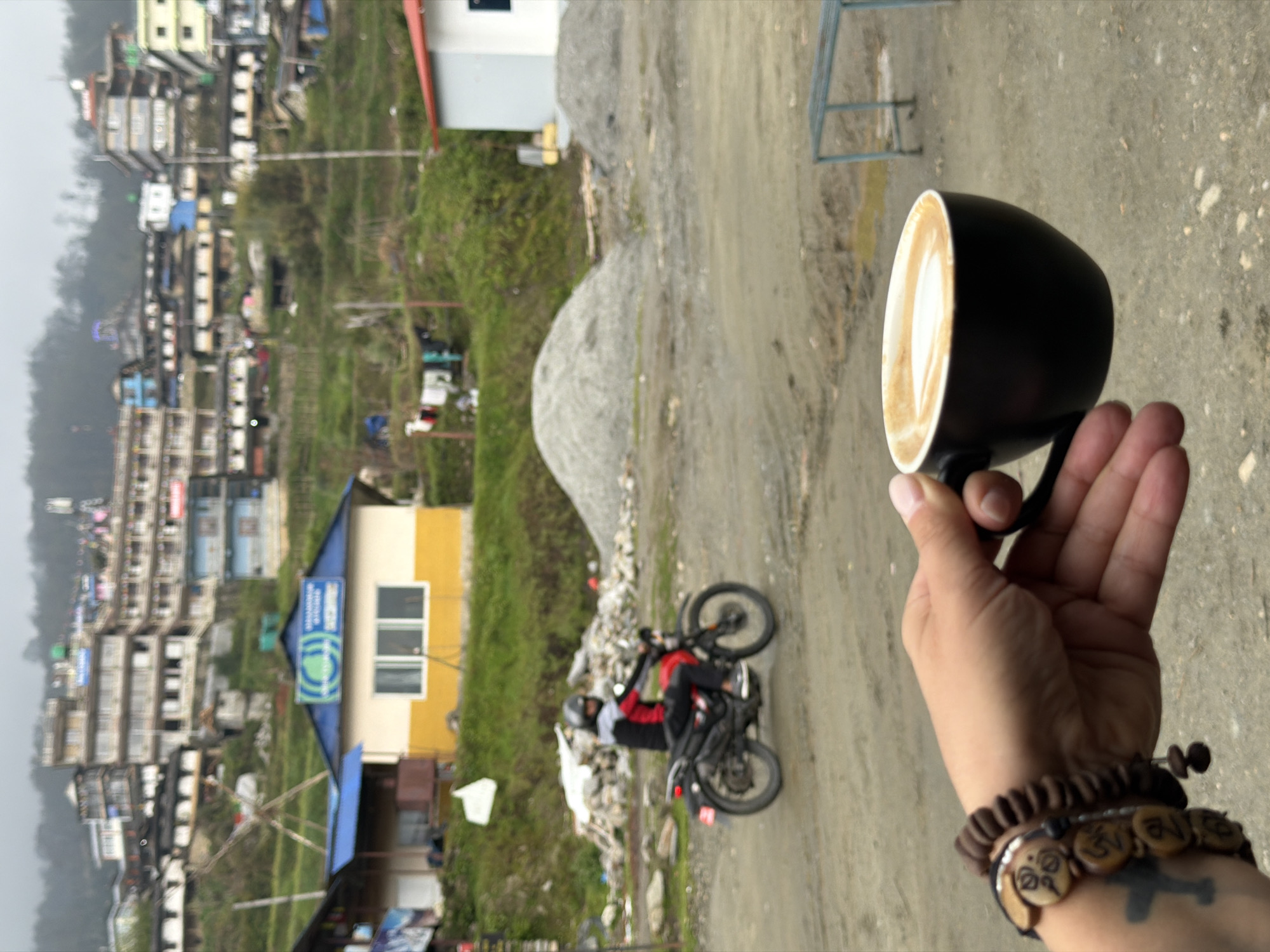 The image captures a scene in Purano Ghandruk, Nepal, under an overcast sky. In the immediate foreground, a person's light-skinned left hand holds a black ceramic mug containing a latte with white latte art. The hand displays a dark, cross-shaped tattoo on the outer wrist and wears two multi-beaded dark brown bracelets, one featuring circular carved wooden elements. The midground features a dusty, light brown dirt road, traversed from left to right by an individual on a black motorcycle. The rider wears a dark helmet and a jacket that is red, black, and white. To the left of the road, a low-slung building with a yellow base, white window frames, and a blue corrugated metal roof stands on a grassy slope. Adjacent to it, a smaller structure with a blue roof is partially visible. Further right, two large piles of light grey aggregate are present on the ground. A light blue metal frame is visible on the far right. Laundry hangs on a line on a distant green hillside behind the aggregate piles. The background reveals a dense cluster of multi-story buildings, predominantly light-colored and of varying architectural designs, ascending a steep, verdant hillside. This forms the village of Purano Ghandruk. The distant slopes are heavily forested under a dull, grey sky.