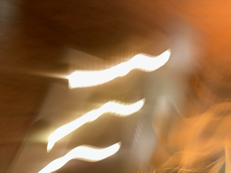 The image displays a heavily blurred, abstract, long-exposure photograph taken in low light conditions, likely an urban environment at night. Three distinct, vertical, wavy light trails in bright white and yellow dominate the left and central portions of the frame, suggesting motion blur from fixed light sources such as streetlights or other luminous urban elements. The background is an indistinct, warm-toned field of dark brown, amber, and orange, indicative of ambient light and reflections within a city. No specific architectural features, street signage, individuals, or vehicles are discernible within the abstract composition. While taken in the city of Manchester, United Kingdom, the visual data's abstract nature and lack of specific details prevent precise identification of a particular location within the city.