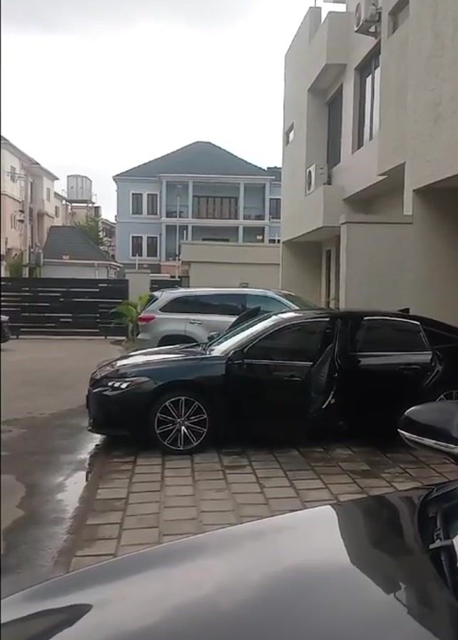 parking area in front of a modern building complex on a cloudy day. In the foreground, a black car is parked with its driver-side door open. Behind it, another silver SUV-type vehicle is parked. In the background, a light blue building can be seen. The ground appears wet, possibly due to rain. There are also some steps leading to a raised area on the left side of the frame. The camera is positioned low, possibly from inside another car.