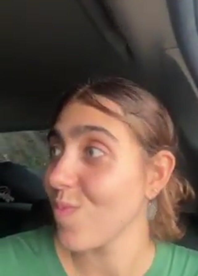 A young woman with light brown hair pulled back and a green shirt sits in the driver's seat of a car