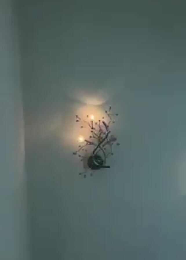stairway in a house. There are four wall lamps with a flower and bead design, placed along the wall next to the stairs. A tall chandelier hangs from the ceiling above the stairs. The stairs have a black and gold railing and tile steps.