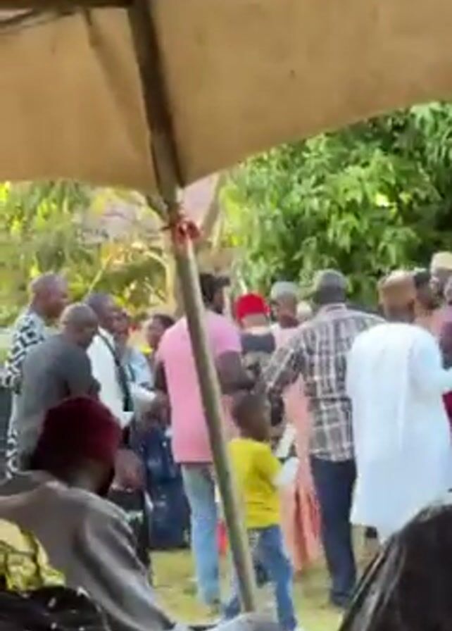 group of people dancing under a tent-like structure, likely at an outdoor event. The people are wearing a variety of clothing, including casual shirts, dresses, and traditional African attire. Several children are visible among the adults. Some people are clapping and appear to be enjoying the music. The environment includes green foliage in the background, suggesting a garden or park setting. The camera angle is low, looking up at the scene from under the tent.