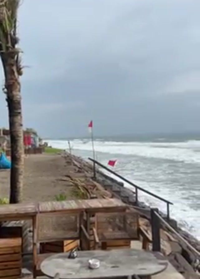 seascape from a restaurant or cafe's patio. The sky is overcast. A palm tree is visible to the left of the frame, bending in the wind. Several people are sitting in the restaurant area. The patio has wooden furniture, including tables and chairs. A short stone wall with a metal railing separates the patio from the beach. The ocean waves are large and white-capped, crashing against the rocky shoreline. Two red flags are planted on the beach, presumably warning signs. The camera slowly pans to the right to capture more of the seascape.