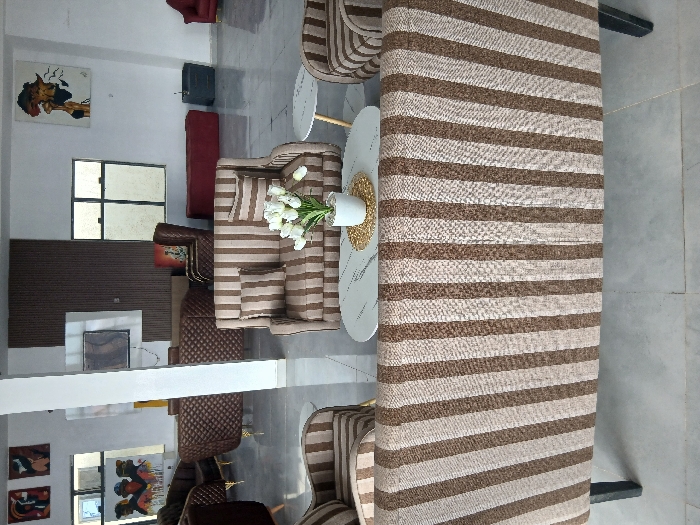 A bright room features furniture with brown and beige stripes. A white table with flowers sits near a striped sofa. A small circular table and another striped chair are also visible. Additional furniture includes a brown diamond-patterned couch and a red upholstered item. Artwork adorns the walls, and windows allow light to enter the space. The floor appears to be made of large tiles.