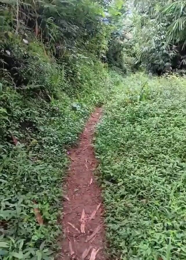 narrow, winding dirt path in a lush, green forest. The path is surrounded by dense vegetation, including various types of plants and bamboo. The camera is positioned on the path, as if someone is walking through the forest. The lighting is somewhat dim due to the canopy of trees overhead. There is no visible person, animal, or artificial structure. The overall atmosphere is one of natural wilderness.