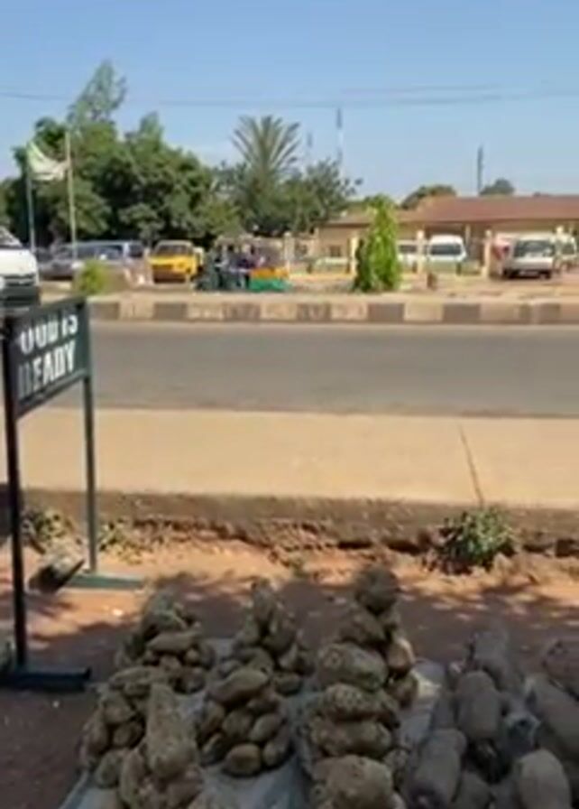 street scene with traffic and pedestrians in what appears to be a market area. In the foreground, there are piles of what look like yams or similar root vegetables for sale, with a sign that partially reads "FOOD IS READY". A white van drives by on the street. A man walks across the road. In the distance, a person carries a bundle of something on their head. A wooden stool with bundles of what appear to be sugar cane or similar is placed near the roadside. The day is sunny and the sky is clear.