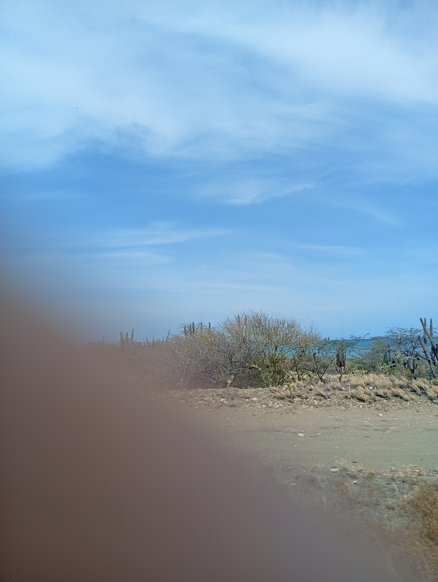 The image depicts an arid coastal landscape in La Guardia, Venezuela. The left approximately 35% of the frame is obscured by a large, blurred, dark brown, amorphous object, possibly a finger or hand. The visible scene features dry, rocky terrain covered with sparse, straw-colored vegetation. Numerous cacti, including tall columnar species and bush-like varieties, are prominent, interspersed with leafless or sparsely leafed dry shrubs and small trees. A horizontal strip of blue water, indicative of a sea or bay, is visible in the far background, positioned beneath the horizon line formed by the dry land and vegetation. The sky, occupying the upper half of the image, is clear and blue with scattered, wispy white clouds. Two small, dark specks, possibly birds, are discernible in the upper left portion of the visible sky. No people, discernible actions, or direct interactions are visible.