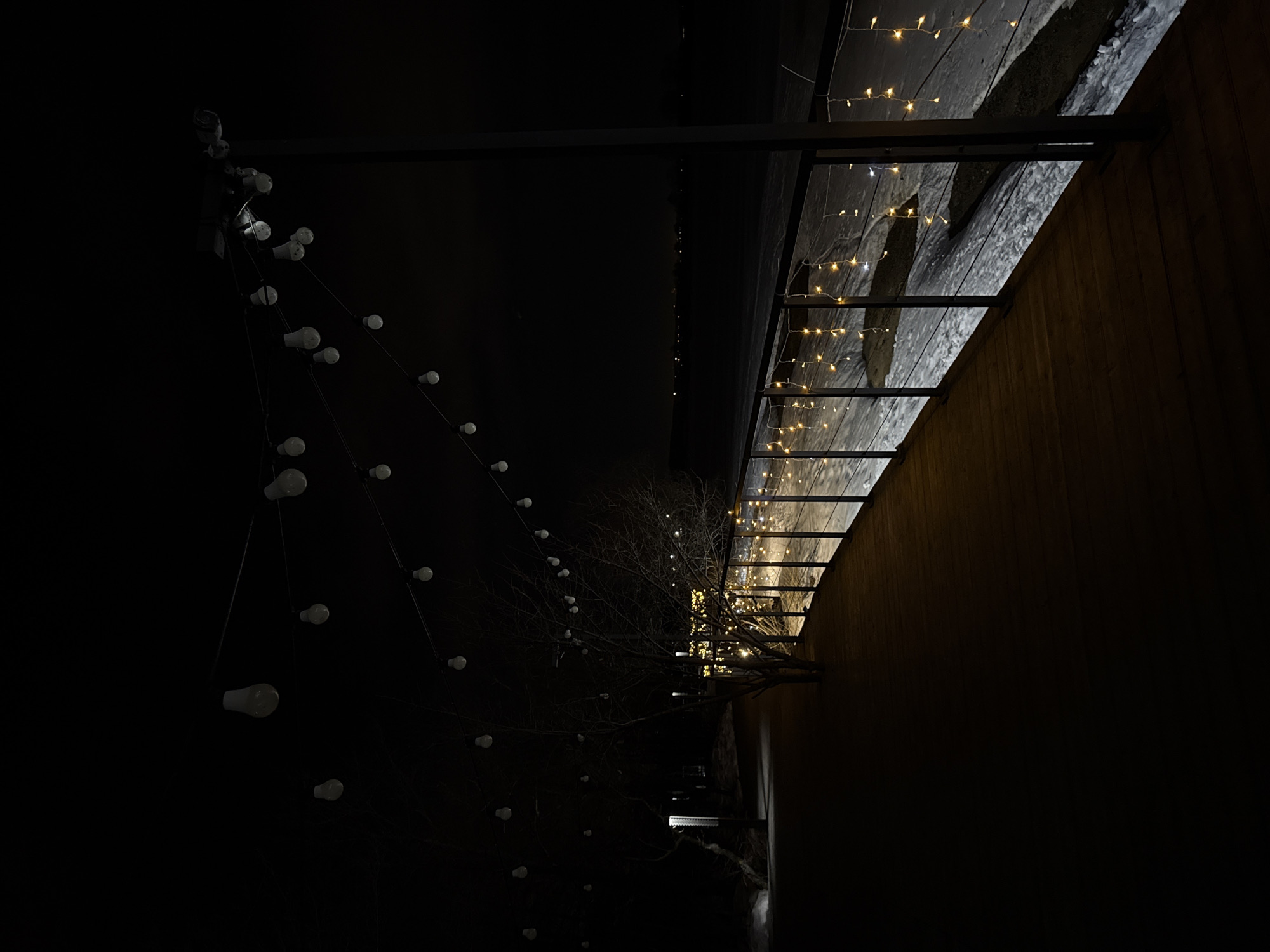 The image depicts a nighttime winter scene, likely a promenade or waterfront area, in the city of Oktyabrsky, Russia. A dark wooden plank walkway occupies the foreground and extends into the mid-ground on the left. To the right of this path, a dark metal railing is visible, adorned with multiple strings of small, warm-toned LED-style lights that drape downwards. Below the railing and to its right is a snow-covered embankment with patches of darker ground exposed. A bare, deciduous tree or large bush stands on the wooden path near the railing, with additional bare trees faintly discernible in the dark background to the left. Overhead, multiple strands of larger, clear or frosted incandescent light bulbs are strung across the scene, providing ambient illumination. A dark utility pole on the far right supports some of these light strands and also features a mounted security camera. The distant horizon reveals a faint line of lights, suggesting an opposite shore or distant urban development across a dark, undefined expanse. No individuals or specific activities are present.