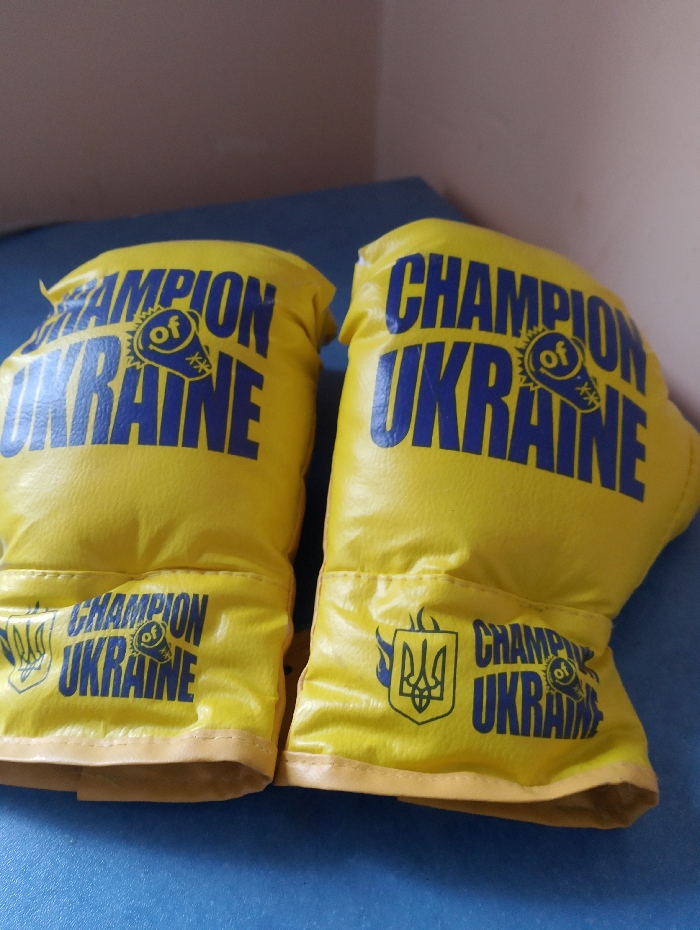 Two yellow boxing gloves are depicted resting side-by-side on a flat, matte blue surface, against a light-colored wall, in Yarun, Ukraine. Each glove prominently displays "CHAMPION OF UKRAINE" in blue capital letters across its upper surface; the word "of" is smaller and centered within a circular emblem featuring a stylized hand or glove with two stars. The cuff of the left glove also bears the "CHAMPION OF UKRAINE" text. The cuff of the right glove features a blue emblem resembling the Ukrainian Tryzub (Trident) surrounded by stylized flames, followed by partially visible "CHAMPION OF UKRAINE" text. No individuals are present, and no actions or interactions are depicted.