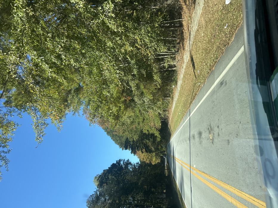 A road with double yellow lines stretches through a wooded area under a clear blue sky. Trees line the left side of the road, their green leaves contrasting with the blue sky. On the right, a grassy verge separates the road from more trees. A vehicle's window is visible on the right edge, suggesting the photo was taken from inside a car. The road surface shows some discoloration.
