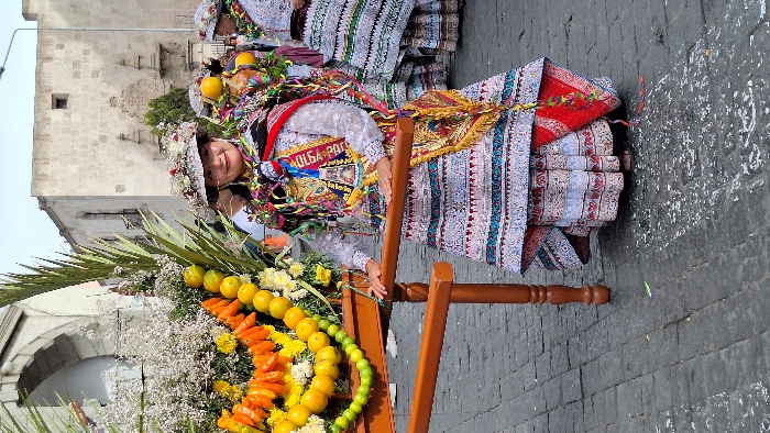 A woman dressed in traditional Peruvian clothing is standing in the street. She is wearing a white blouse, a colorful skirt, and a hat adorned with flowers and fruit. She is holding a wooden cross decorated with flowers and fruits, including lemons and oranges. In the background is a building with a stone facade. The street is paved with stone.