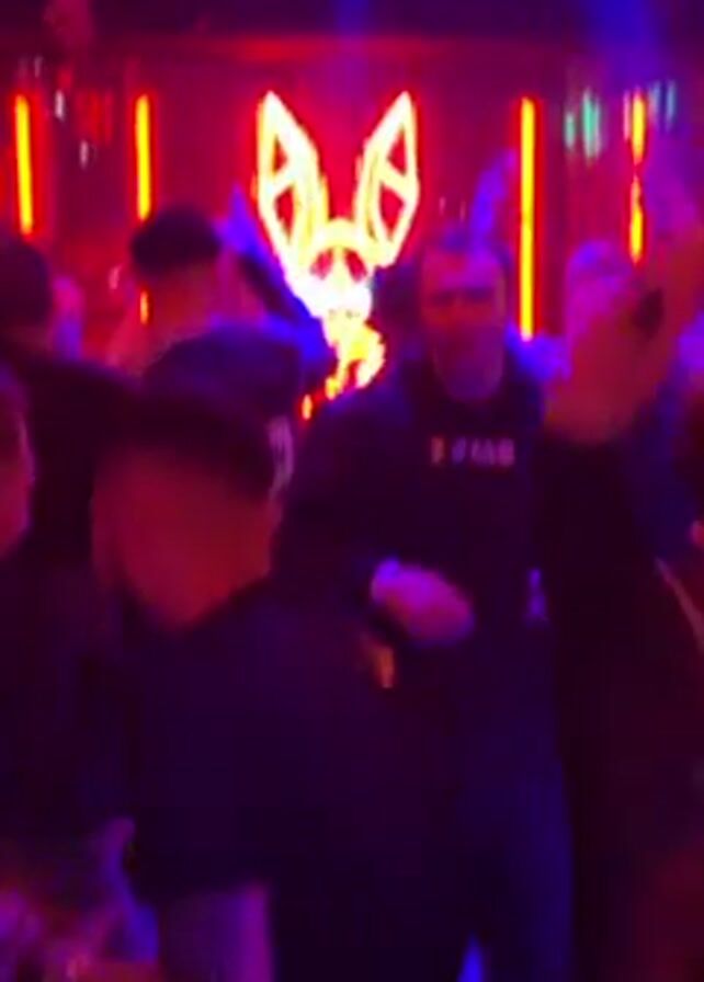 dimly lit nightclub with a crowd of people dancing to music. Red and blue lights flash throughout the room. A red neon sign depicting a rabbit's head and ears is visible in the background. There are hanging plants and other decorations on the ceiling. The people are mostly young adults, dressed in casual clothing.