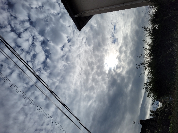 A low-angle shot reveals a cloudy sky pierced by sunlight. Overhead power lines stretch diagonally across the frame, contrasting with the soft, textured clouds. At the top, a building overhangs, while foliage densely borders the right side. A rooftop with a chimney is visible at the bottom right. The sky exhibits varying shades, from bright white near the sun to darker gray hues in the cloud formations.