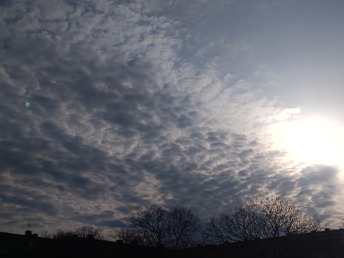 The image depicts an expansive cloudy sky above a silhouetted urban horizon, taken in the city of Plovdiv, Bulgaria. The sky is largely covered by a dense formation of dark grey altocumulus clouds, exhibiting a distinct ripple-like pattern across the central and left portions. The sun, appearing as a bright, overexposed light source, is visible in the upper right quadrant, partially obscured by lighter cloud formations. A small, circular, greenish-blue lens flare is present in the upper left quadrant. The lower quarter of the image features the dark silhouette of a city skyline, comprising several bare deciduous trees with visible branches and the rooftops of multiple buildings. A television antenna is discernible on a rooftop in the lower left section. No individuals, specific actions, or interactions are visible.