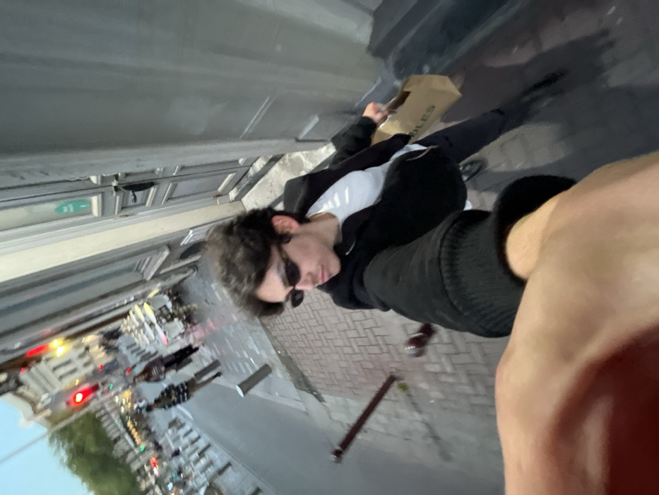 The image presents a wide-angle, low-angle perspective of a street scene in Lille, France, under conditions of low light, consistent with dusk or early evening. The central subject is a young male with dark, wavy hair, wearing dark, oval sunglasses, a white t-shirt, and a dark zippered jacket. He holds a light brown paper bag, partially displaying the text "HOLES," in his right hand. His left arm is extended towards the camera, indicating a self-portrait or wide-angle shot. He is positioned on a reddish-brown brick sidewalk. To the subject's right, a tall, gray double wooden door with intricate paneling and a dark handle is visible, set within a light-colored building facade. A small green sign with the number "1" is affixed above the door. The street, running parallel to the subject's left, features a red traffic light in the distance and several blurry pedestrian figures on the opposing brick sidewalk. This opposite side of the street includes outdoor seating from a cafe or restaurant, with visible white tables and chairs. Dark bollards line the sidewalks; a rusted red bollard is partially visible in the lower-left foreground. Artificial lighting from streetlights and building interiors is active, contributing to the scene's illumination.