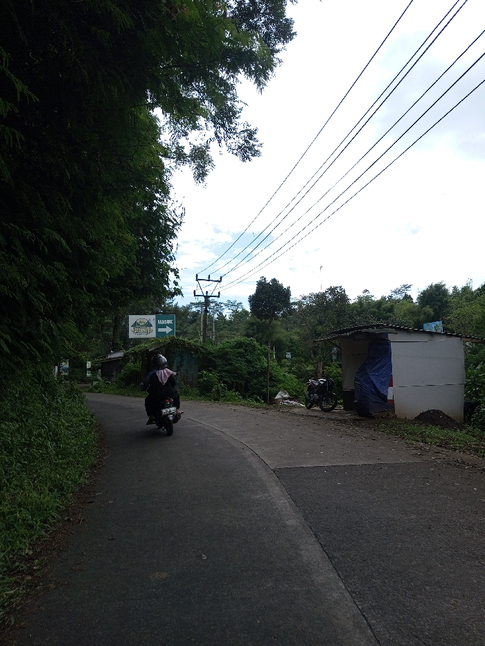 The image depicts a narrow, winding asphalt road ascending through a vegetated environment under an overcast sky. A single individual, wearing a helmet and a dark jacket with a light-colored head covering, operates a dark-colored scooter, traveling away from the viewer on the road's left side. Dense green foliage and undergrowth line the left side of the road and extend into the background. On the right side, an unpaved area leads to a small, simple structure with white-painted walls and a corrugated metal roof; a blue tarp covers a portion of its side. A second dark-colored motorcycle is parked adjacent to this structure. In the middle ground, a wooden utility pole with multiple overhead power lines is visible, extending across the upper portion of the frame. A green and white directional sign, featuring a right-pointing arrow and the Indonesian word "MASUK" (meaning "ENTER"), along with a logo or text resembling "GADING" and a mountain icon, is positioned on the left side of the road, further back than the scooter. The visible elements, specifically the "MASUK" sign, indicate an Indonesian linguistic context, which contradicts the specified location of Ariyalai, Sri Lanka. The terrain in the background consists of dense green trees and vegetation on rising ground.