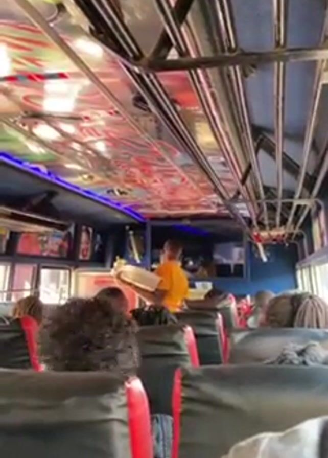 The inside of a decorated bus is shown, filled with passengers. The bus has customized features like blue lights, TVs, and pictures of people along the side walls. A vendor, wearing an orange shirt, walks down the aisle, offering food to the passengers from a white container he carries. Passengers are mostly facing forward, some turn to interact with the vendor. Music is playing loudly in the background.