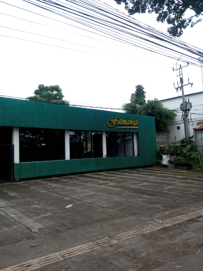 An outdoor scene in Khajuripada, India, depicts a single-story commercial building under an overcast sky. The building features dark green corrugated metal siding and multiple large, rectangular, dark-tinted windows with white frames. A gold-colored script sign reading 'Fatmawati' is affixed to the upper facade. The foreground consists of a concrete slab pavement with visible tactile paving strips. To the right of the building, a concrete wall, dense green vegetation, and a utility pole with multiple overhead power lines are visible. A white building is partially obscured behind the utility pole. No individuals are present. Multiple thin black power lines traverse the upper portion of the frame. Green tree foliage is visible above and behind the structures.