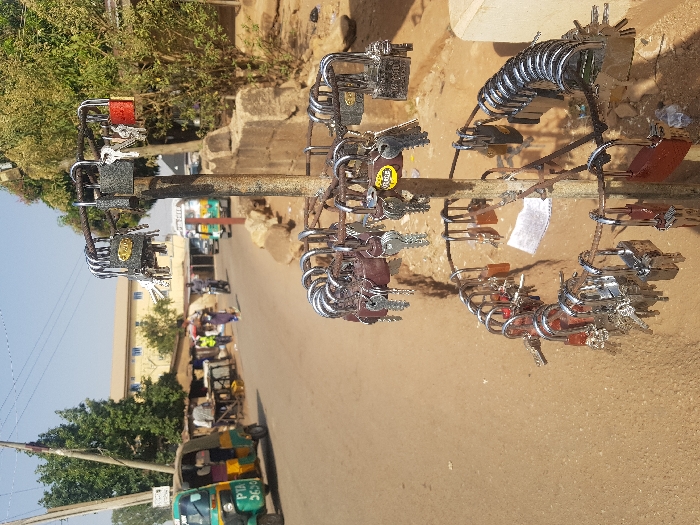 The image depicts a daytime street scene in Jos, Nigeria. A rusty, vertical metal pole in the foreground on the right serves as a display stand, featuring three horizontal, circular tiers. Each tier is laden with numerous padlocks of various sizes, colors (including silver, red, brass, and black), and designs, with many having their corresponding keys attached or hanging from the shackles. A crumpled piece of white paper is visible on the middle tier. The ground around the pole is dry, light brown earth, with a concrete or large rock structure to its immediate right. To the left, a light-brown paved road extends diagonally into the distance. A green and yellow auto-rickshaw (Keke Napep), bearing the registration "PTA 3630," is positioned on the left side of the road, with two individuals partially visible inside. Further down the road on the left, several makeshift market stalls with wooden tables and tarpaulin covers are present. Pedestrians are scattered along the road, including one individual wearing a yellow safety vest and another on a motorcycle, both moving away from the viewer. Utility poles and overhead power lines are visible above the road on the left. In the background, a multi-story building with a light yellow facade and dark windows stands prominently behind the market stalls. The sky above is clear and light blue, and green trees are visible throughout the background.