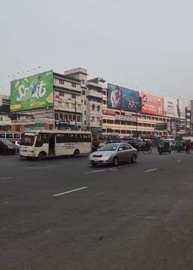 street scene in what appears to be a densely populated city, likely in South Asia. The road is wide with multiple lanes of traffic, including cars, buses, auto-rickshaws, and motorcycles. Several people are visible on the sidewalks and crossing the street. The buildings lining the street are multi-storied and topped with large billboards displaying advertisements for various products and services, including Sprite, mobile phones, and clothing brands. The sky is overcast, suggesting a cloudy day. The video appears to have been shot from a static position on the side of the road. The overall impression is of a busy, urban environment with a mix of public and private transportation.