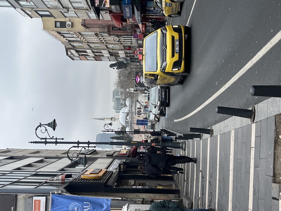 The image displays a daytime street scene in Beşiktaş, Istanbul, Turkey, under an overcast sky. The perspective is looking down a street with a central roadway flanked by sidewalks and multi-story buildings. On the left, a pedestrian sidewalk is paved with dark gray tiles interspersed with light gray horizontal stripes. Several black, conical bollards are embedded along its edge, with some appearing bent or damaged. Multiple pedestrians, dressed in winter attire, walk away from the camera on this sidewalk. Adjacent to the sidewalk are multi-story commercial buildings, featuring storefronts with signs and banners, including a blue banner partially visible on the far left that reads "BAU." Several ornate black streetlights with curved arms are positioned along the sidewalk. The roadway occupies the center and right side of the frame. It is an asphalt surface with a continuous white line marking the separation from the sidewalk on the left. Traffic is moving away from the viewer. A prominent yellow Citroën van, functioning as a taxi, is in the foreground, displaying the license plate "34 TKG 18." Behind this taxi, a line of cars includes a dark-colored sedan. Another yellow taxi is partially visible further down the road. On the right, multi-story residential and commercial buildings line the street. These structures exhibit varied architectural styles, some with balconies and ground-floor businesses featuring awnings and signage, such as "BLACK & WHITE" and "FORUM." In the background, a large mosque with a central dome and a single minaret is distinctly visible, identifiable as the Sinan Pasha Mosque. Behind the mosque, taller, modern high-rise buildings are visible against the pale gray sky. A few birds are faintly discernible flying in the upper sky.