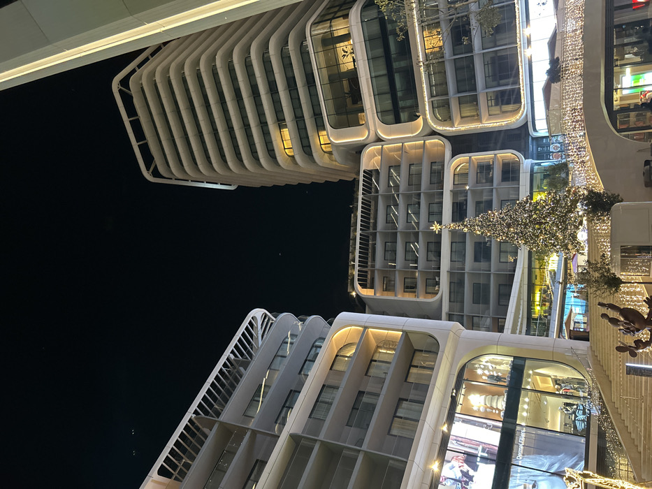 Modern architecture dominates the night scene. Arched, illuminated buildings frame a dark sky. A Christmas tree glittering with lights stands between structures. One building features stacked, rounded segments, while another showcases a more angular design with numerous windows. Architectural lighting enhances the unique shapes and edges of the buildings, creating a contemporary urban landscape.