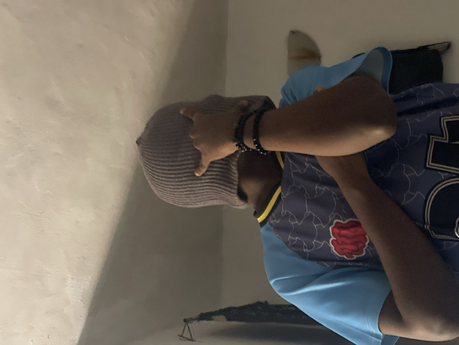 A single individual is depicted indoors, viewed from the chest up. The subject's face is fully concealed by a grey, ribbed balaclava. They wear a short-sleeved shirt with light blue sleeves and a dark blue/purple body featuring a repeating pattern and a red, stylized emblem on the left chest, complemented by a yellow neck trim. Two black beaded bracelets adorn the subject's right wrist, which is raised, forming a 'devil horns' hand gesture with the index and pinky fingers extended. The left arm is bent across the torso. The background consists of light-colored, textured interior walls with visible staining and discoloration, particularly in the upper right. Partially visible elements include a dark, hanging object on the left and a light-colored, curved wall fixture on the right. No interactions are evident.