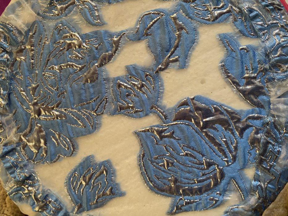 The image displays a close-up, top-down view of an embroidered textile fragment, likely located in Kuje, Nigeria. The primary subject is a pattern composed of light blue fabric pieces shaped into botanical or floral motifs, such as leaves and petals. These blue elements are densely outlined and filled with shiny silver metallic embroidery thread, creating a raised, textured effect. The blue fabric segments are affixed to or integrated with a translucent white or off-white sheer background material, possibly tulle or organza, which is visible in the negative spaces between the blue patterns. Some edges of the blue fabric show minor fraying, and faint irregularities or minor stains are present on the white background material. No people, discernible actions, or environmental context beyond the textile are visible.
