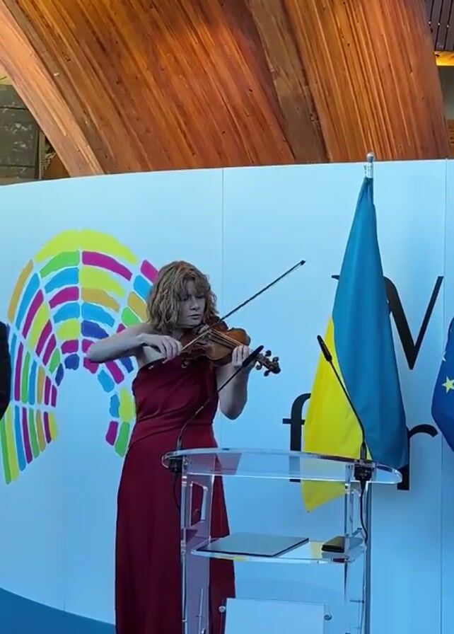 A woman stands at a clear podium, playing the violin. She is wearing a red dress and has blonde curly hair. To her left is a colorful graphic, and behind her on the right are the flags of Ukraine and the European Union. The podium has a logo for the Council of Europe. The space has a high ceiling with wooden beams.