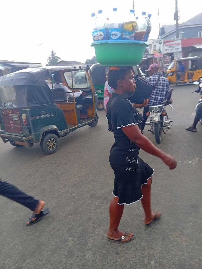 The image depicts a daytime street scene in Aba, Nigeria. A dark-skinned woman, wearing a black dress with white trim and brown flip-flops, walks from right to left across a paved road. She balances a green plastic basin on her head, which contains multiple plastic bottles of "Eva" branded water and other beverages. Her left hand holds a dark bag or object. To the woman's left, a dark green and brown motorized tricycle (Keke NAPEP) with a visible license plate "GJ 8484 Aba" is moving or parked; a driver is seated inside. In the foreground, partially visible on the far left, are the lower legs and dark flip-flops of another person walking in the opposite direction. In the background, to the right of the central woman, a man in a plaid shirt and baseball cap stands near a parked motorcycle. Further in the background, a yellow tricycle and other vehicles are visible on a busy urban thoroughfare lined with buildings. The sky is overcast.