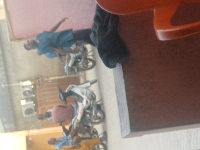 People sit on motorcycles in front of a building. Air conditioning units are visible on the building's exterior. One man stands by his motorcycle with an arm raised. The scene is partially obscured by a dark object and an orange structure. The image is slightly blurry.